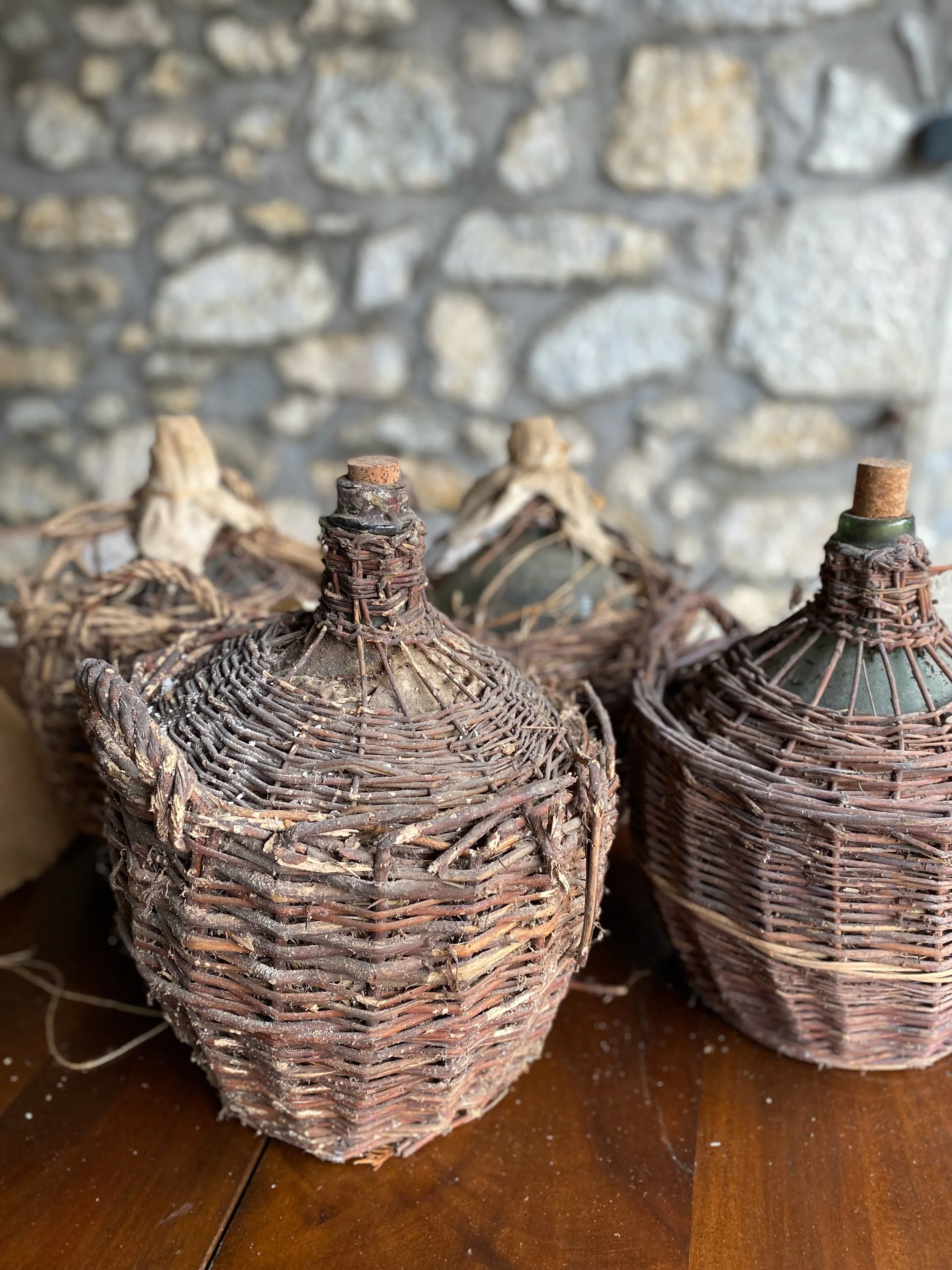 French demi-johns, or carboys, have a rich history dating back to the 17th century when they were first used to transport and store liquids like wine, cider, and oil and typically held between seven to 19 liters (two to five gallons). To protect the delicate glass and its contents, these bottles were often encased in sturdy wicker, which prevented breakage and shielded the liquids from sunlight. Demi-johns were widely made and used in Europe in countries with robust wine production.