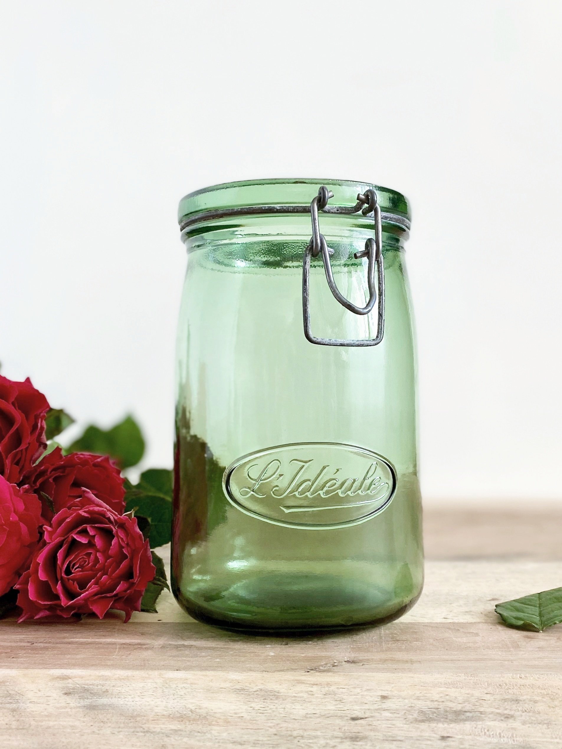 L’Idéale brand French canning jars in a beautiful hue of green and embossed with the “Thistle” emblem.